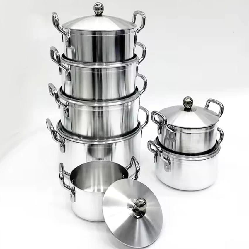 Set of 7 heavy pots with heat-resistant steel lids.