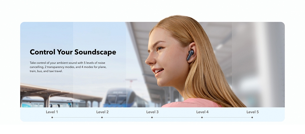 Take control of your ambient sound with 5 levels of noise cancelling,2 transparency modes,