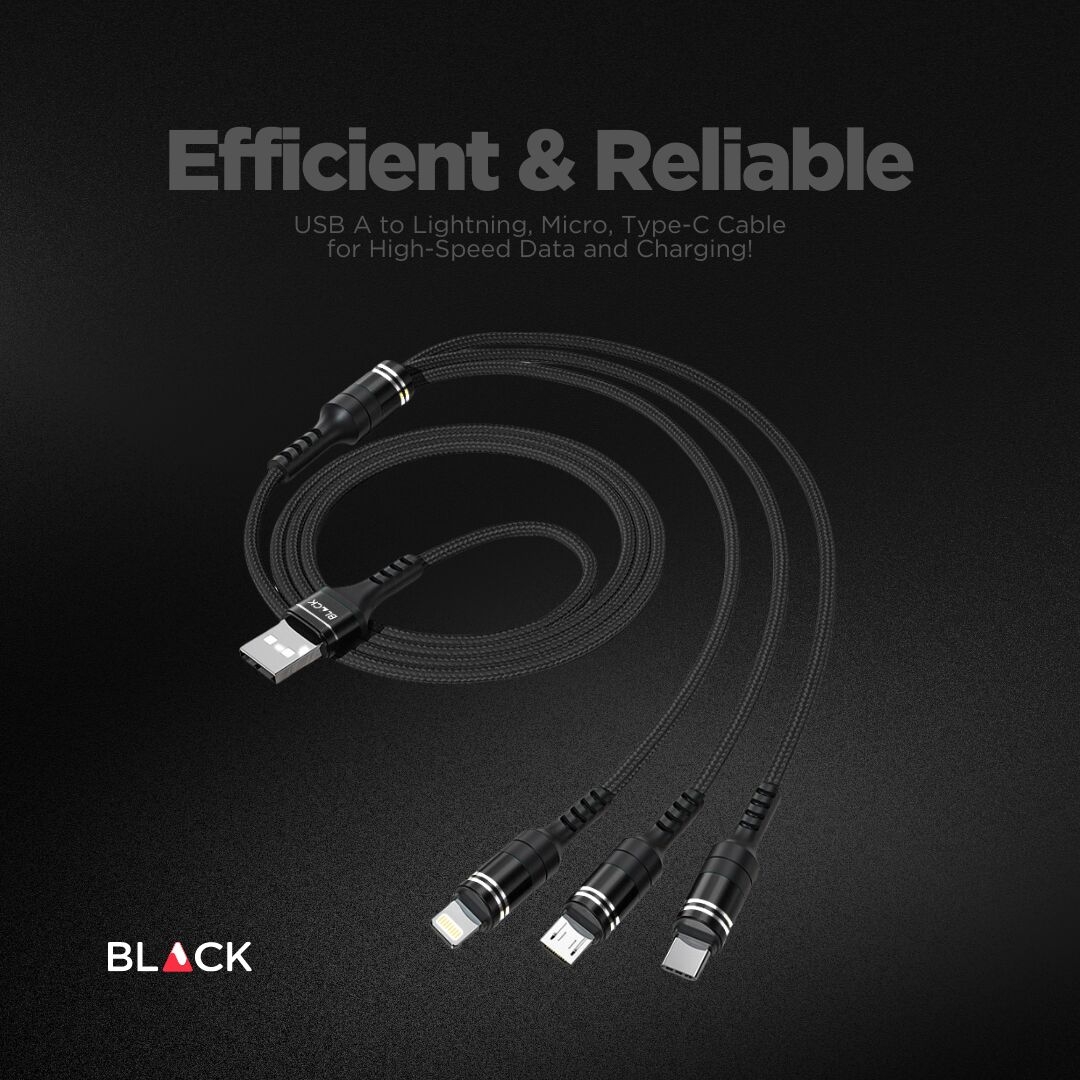 Versatile Connectivity: Designed with USB A input and three output options – Micro USB, USB C, and Lightning (2.4A) – the BLACK Cable M is compatible with a wide range of devices, including smartphones, tablets, and more.