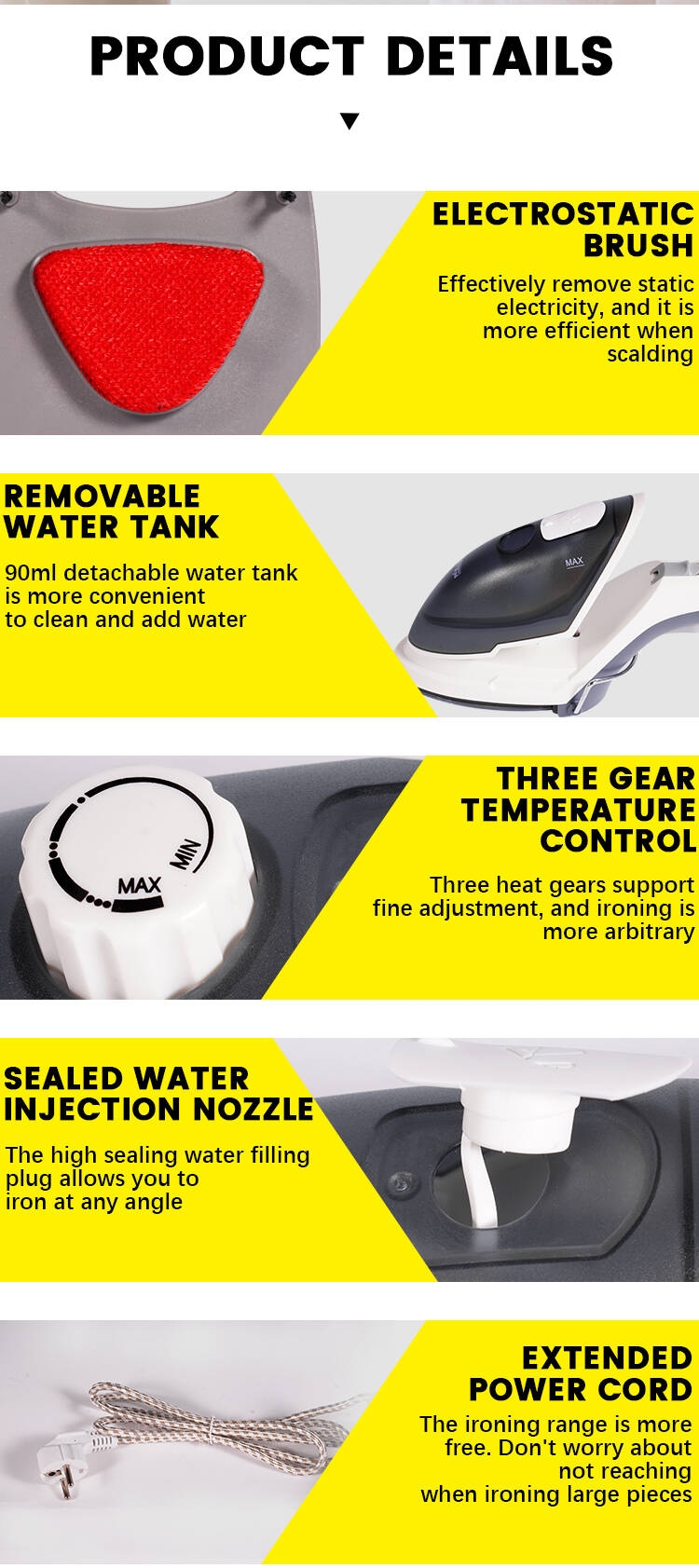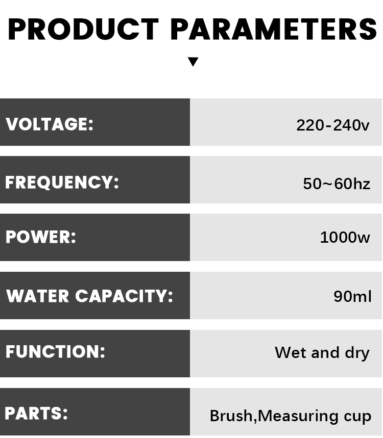 Voltage: 220-240V~50/60Hz Output: 1000W Capacity: 90ml Ceramic coating plate Removable water tank Overheating protection Function: Dry ironing, Burst of steam