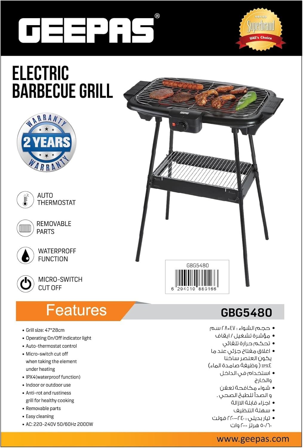 Perfect for both indoor and outdoor cooking, this Geepas GBG5480 Electric Barbeque Grill is quick to assemble. It has durable heating elements that automatically switches off when overheatswith its auto-thermostat control feature. The grill has anti-rust and anti-rot properties that ensure healthy cooking. It comes with removable parts that make cleaning easy.