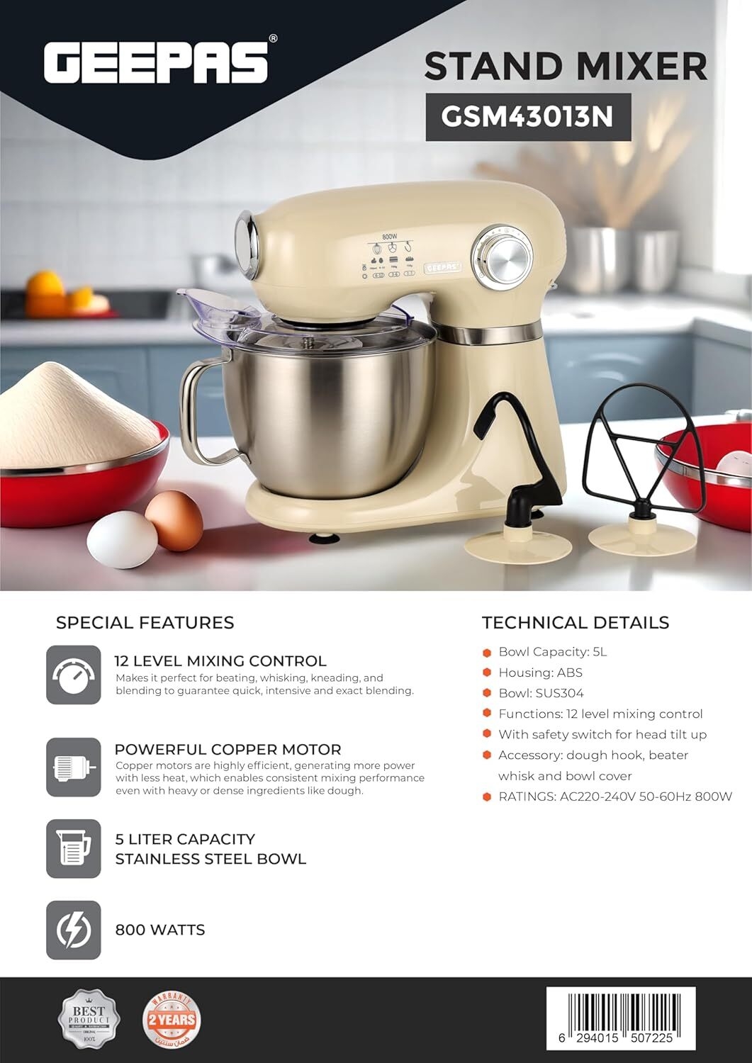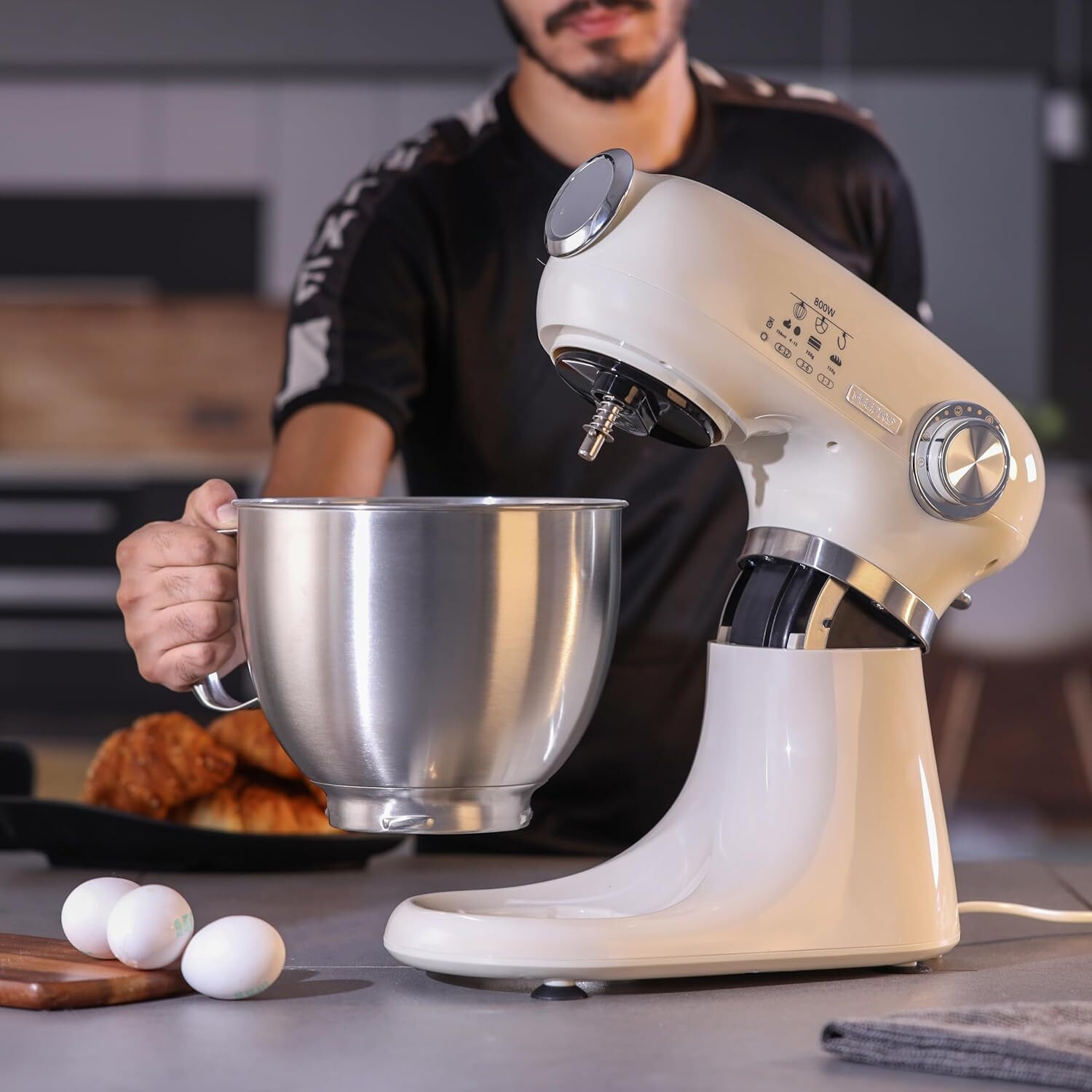 3 In 1 Mixer Cum Blender 600w - 7 Level Speed, 5 Litre Stainless Steel Bowl, Splash Guard Convenient Design with Wisk, Dough Hook & Beater -Multi
