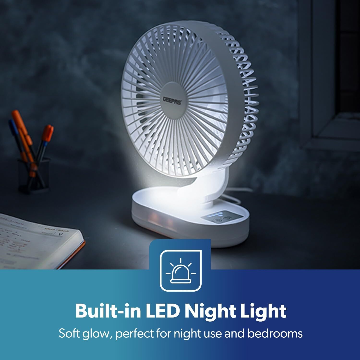 This table fan is equipped with a nightlight on the side.