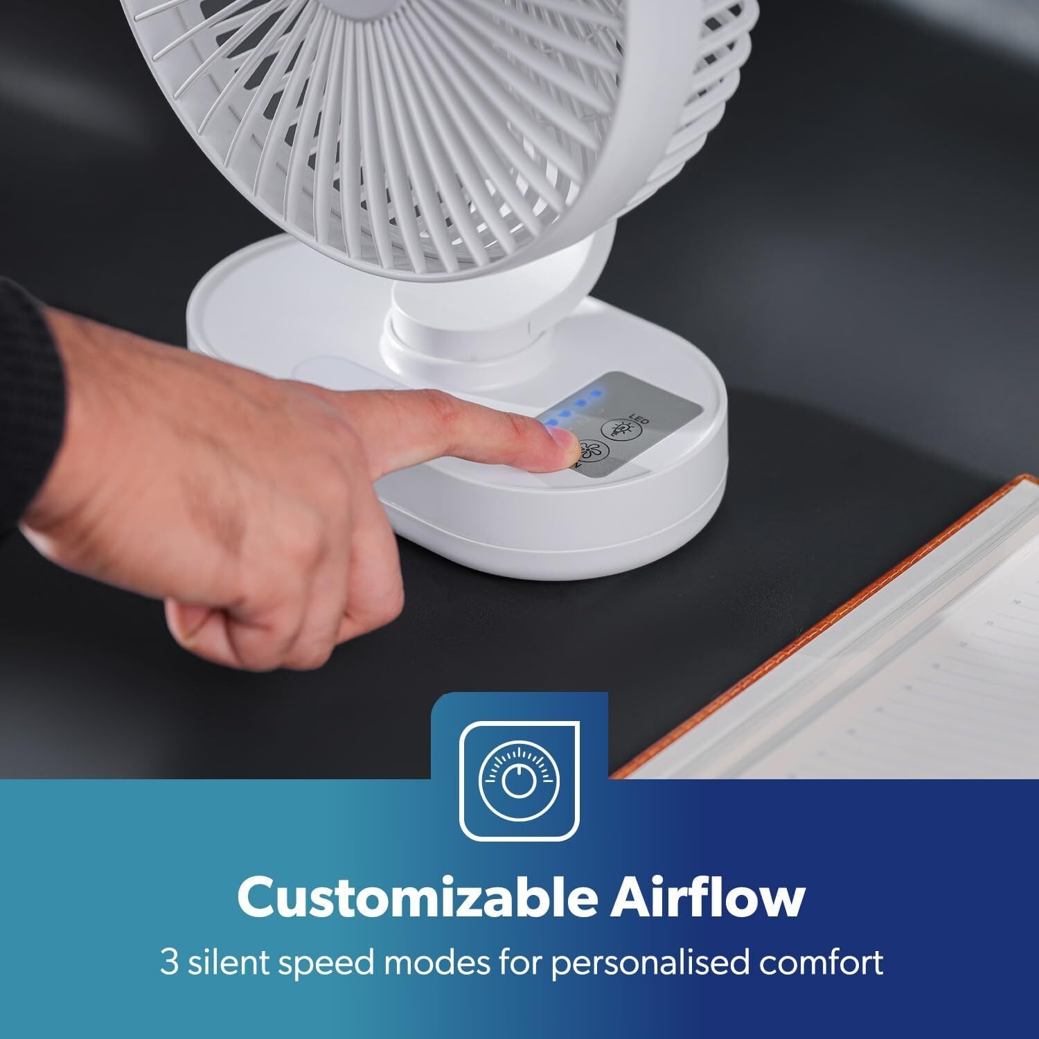 Farewell to office heat. Designed with three precision-engineered ABS blades and three fan speeds to provide quiet cooling at lower speeds, The upgraded electric motor ensures a quiet yet powerful operation. With the variable tilt mechanism, the silent table fan can be easily tilted up or down inside its frame, allowing you to direct the airflow wherever you want.