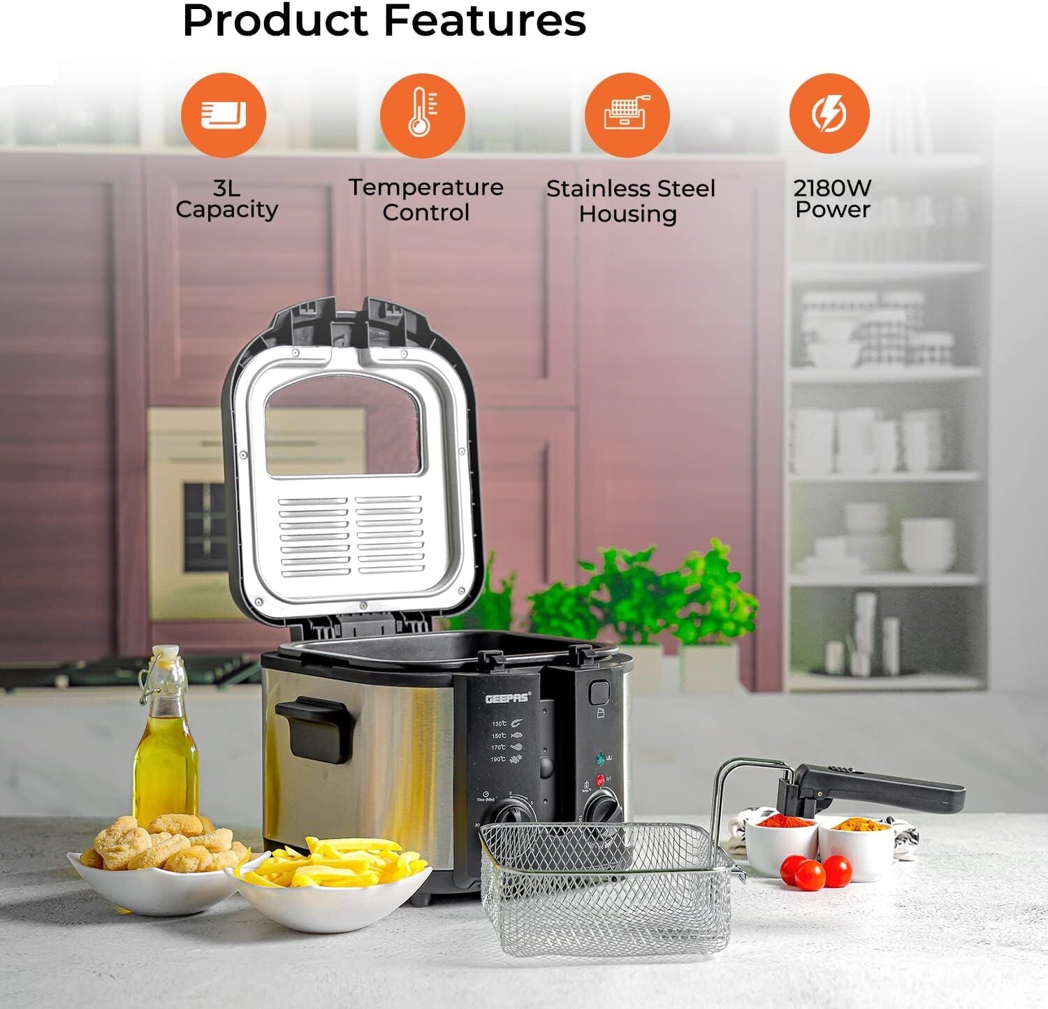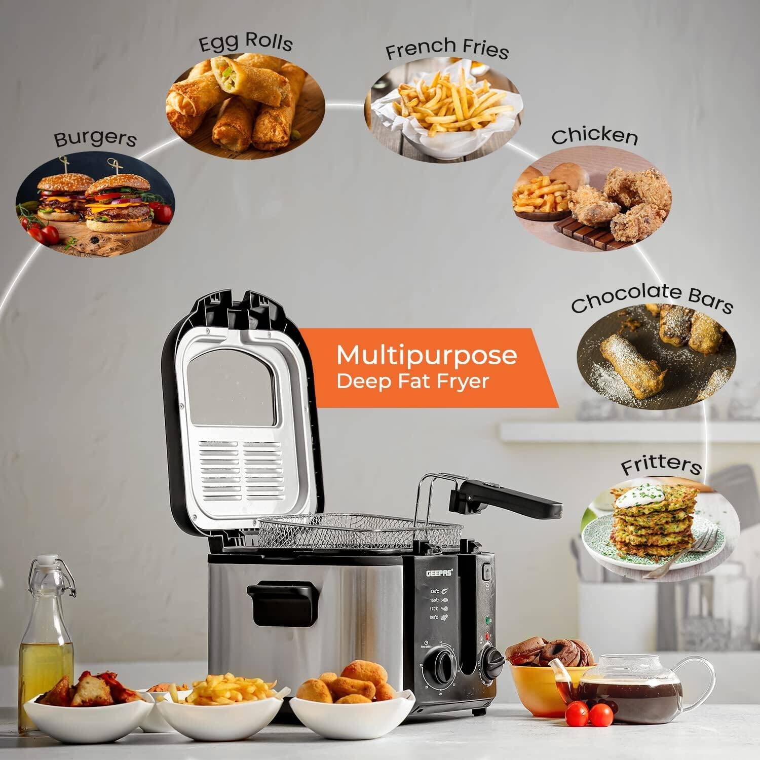 Solution that have many attractive features Forget the fish and chip shop and make your own at home with Geepas Deep Fat Fryer. The Deep Fryer opens up an exciting world of culinary possibilities - stick to fail safe fish and chips or turn your hand to the many other recipes options such as deep fried doughnuts, fritters, chocolate bars, popcorn chicken, spring rolls - the list is endless! Compact enough to fit on a countertop or be stored away if needed, but big enough to cook A delicious meal. Great for domestic kitchens, caravans, student accommodation, holiday homes, small cafes and so much more! Prepare crispy, delicious fried foods in this Easy Clean 3.0 L Deep Fryer.