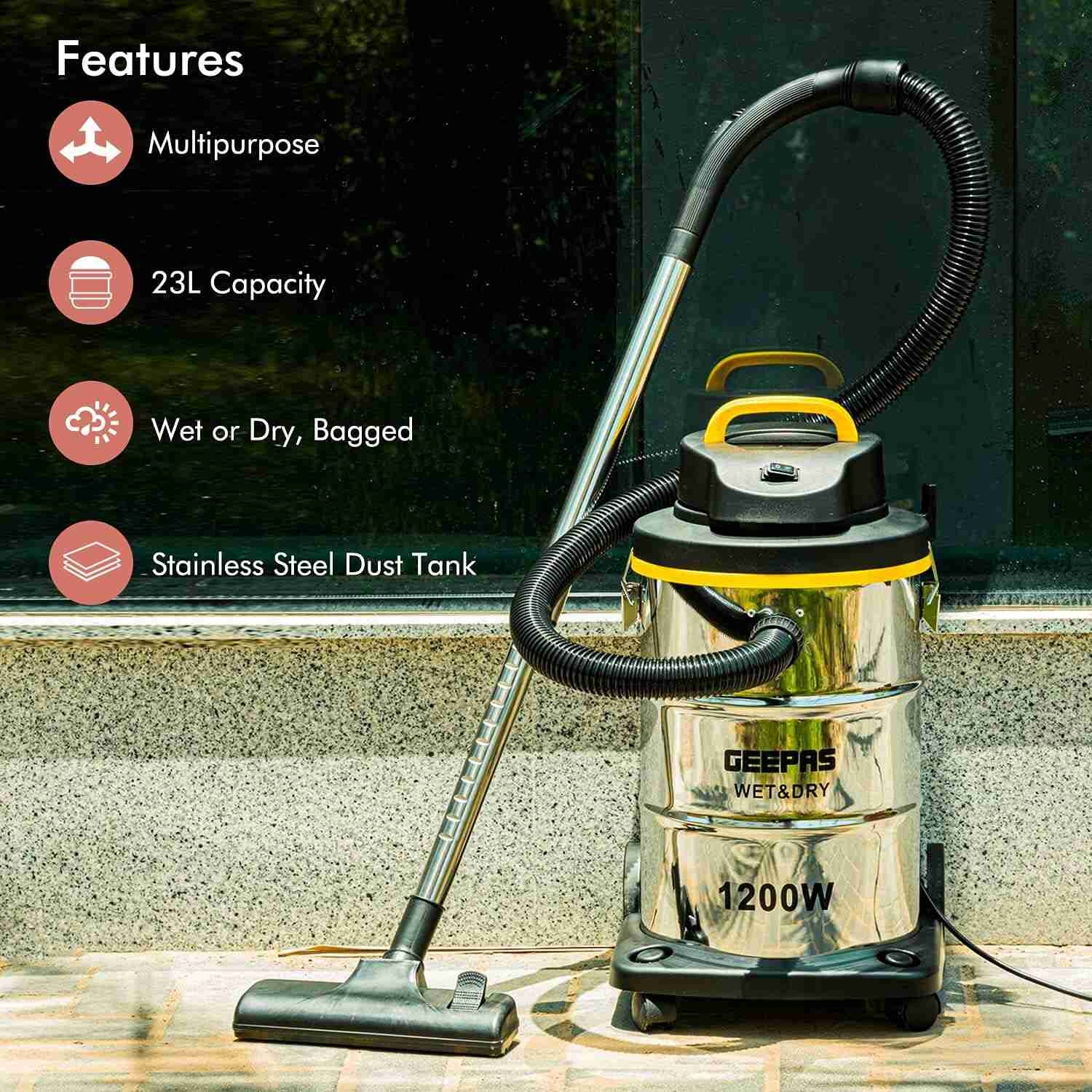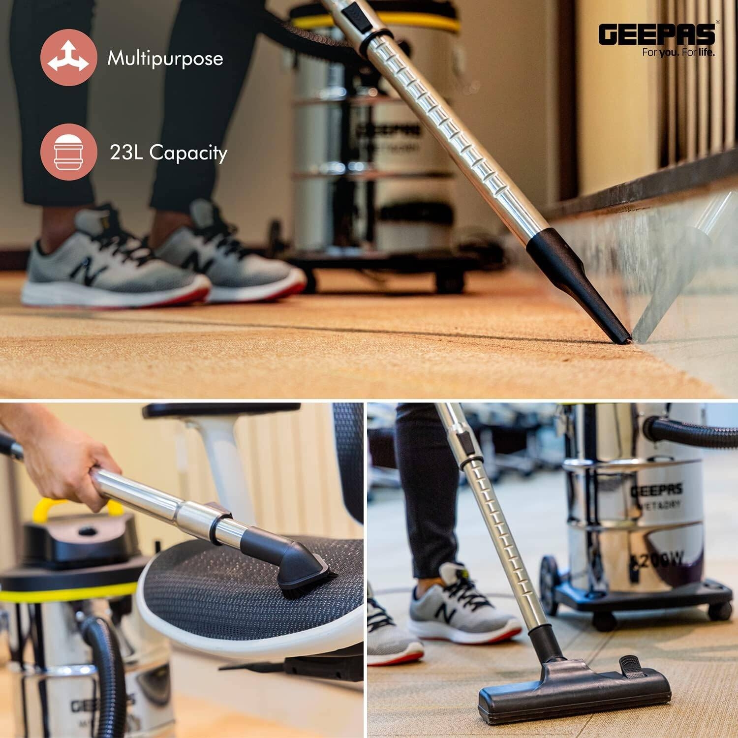 Geepas Dry Vacuum Cleaner helps you remove the dust, wrappers, and other trash from your home with ease. It has dual functioning and works just as fine as a wet cleaner. It can help you clean up coffee spills; water puddles and splashes quickly and efficiently. It has a large dust bag storage of 23 liters and a stainless steel tank. With this much space, it can handle a few cleanings without emptying and saves your time.