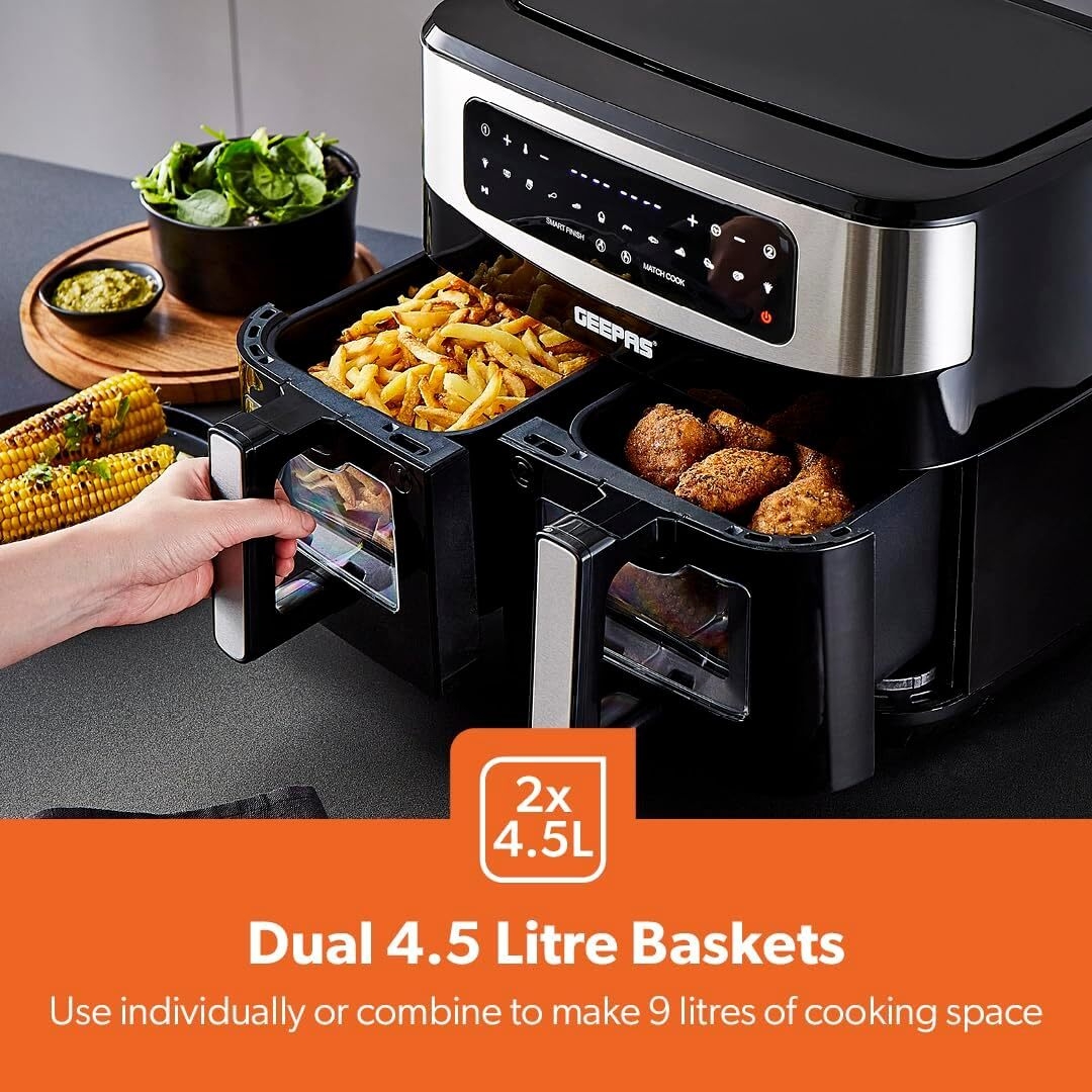 With Two 4.5L non-stick baskets, 9L total capacity easily feeds a family of four or more.