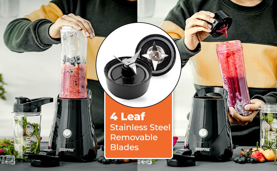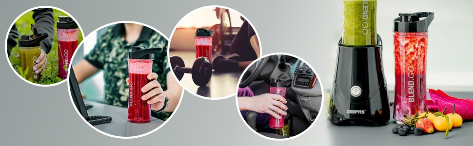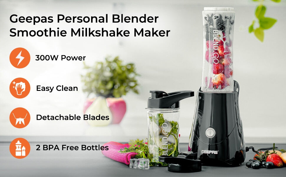 Ideal for making sports drinks, protein shakes, healthy fruit and vegetable thick smoothies, and milkshakes. One-touch blending action with angled stainless-steel blades. If you want to live a healthy lifestyle and add more fruit and vegetables to your diet, the Geepas personal blender is a great way to start. You can enjoy your favorite drink anywhere and whenever with this portable compact bottle.