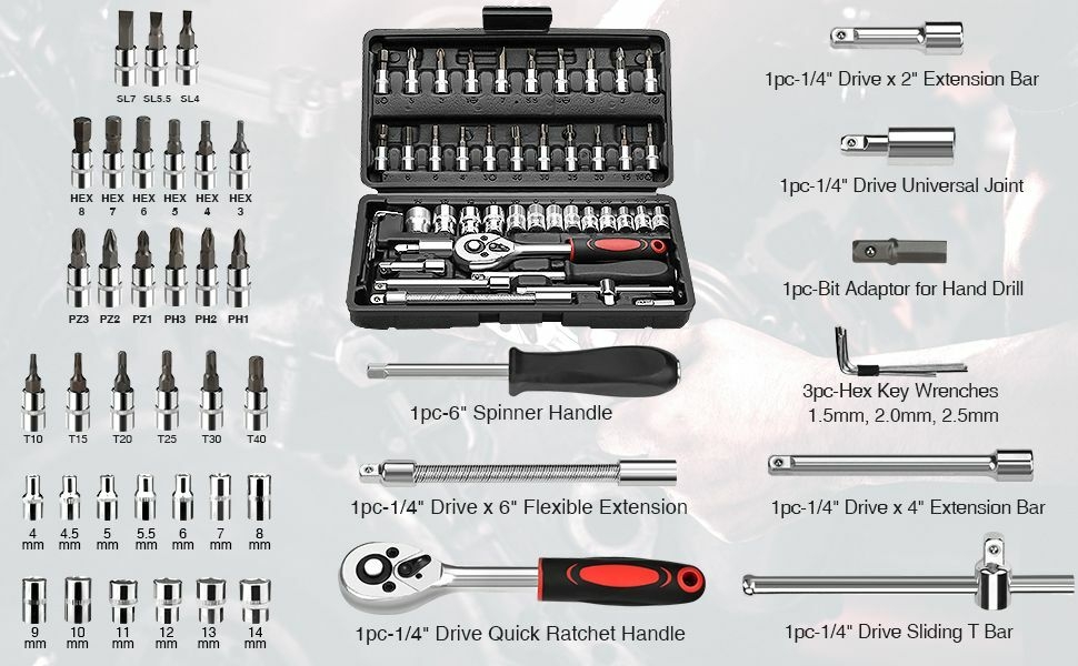 ♞ Socket wrench set: With rotary bit 21 pieces, cross, meter 123, a word 45.57; hexagonal 345678; flower T10T15T20 T25T30T40 3 pieces hexagonal wrench: 1.5, 2, 2.5mm; 1pc 1/4 metric socket: 4, 4.5, 5, 5.5 6, 7, 8, 9, 10, 11, 12, 13 14mm; 3 pieces 1/4 Multi-Directional Fitting; 1pc 1/4 Ratchet; 1pc 1/4 short joint bar (50mm); 1pc 1/4 small square bar (140mm); 1pc 1/4 Long connection bar(100mm); 1pc 1/4 Flexible bar (140mm); 1pc 1/4 Slider(140mm); 1pc 1/4AD motorized swivel head.