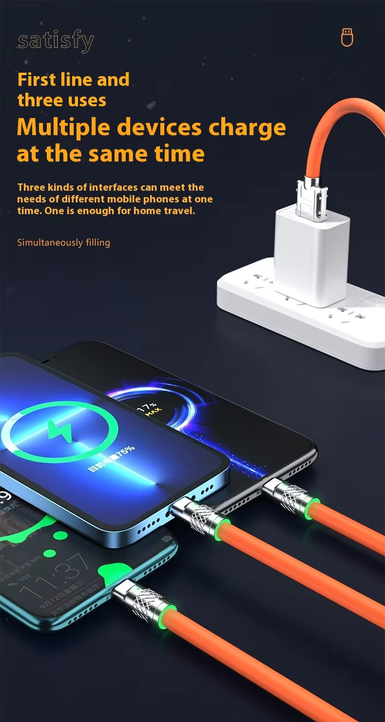 Heavy Duty Unbreakable Material: This multi charger cable is made from a new liquid silicone material which is surprisingly soft to the touch. Exceptional durability and flexibility to withstand more than 40,000 bending tests. All connectors are made of zinc alloy, which increases the strength by 700%