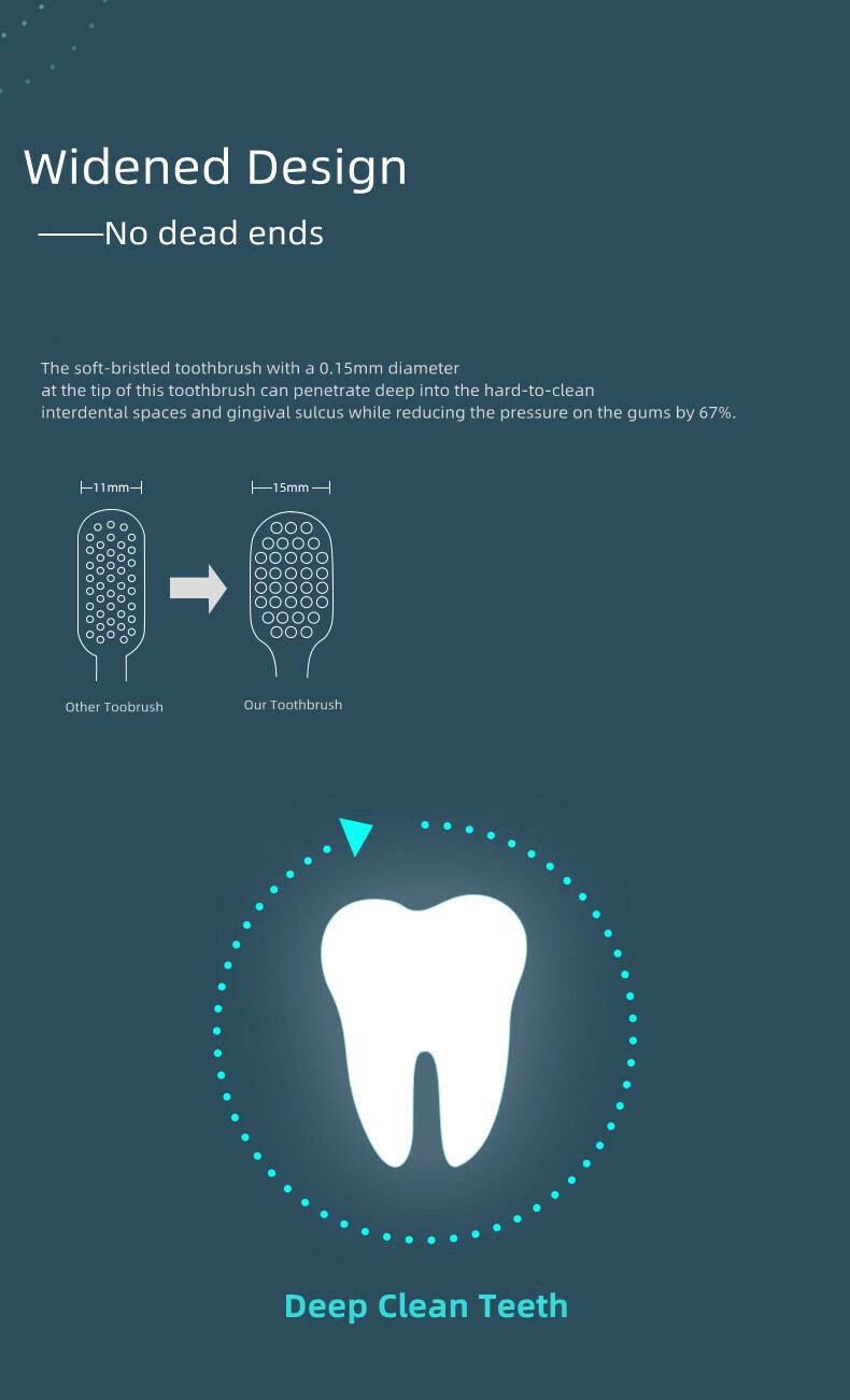 New high quality.With 15mm toothbrush head, you can deeply clean your teeth, every corner.Micron soft hair, more effective and gentle care for gum health.It adopts environmentally-friendly and antibacterial fiber hair, which is environmentally safe.Suitable for bleeding gums and gums.