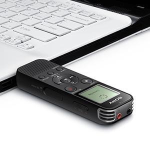 USB direct connection for quick file transferTransferring files to or from your computer is fast and convenient. Just plug the ICD-PX470 straight into a free USB port for an immediate connection—no USB cable needed. | Expand your memory with the micro SD card slotThe ICD-PX470 comes with 4 GB of memory built-in, which gives you a max recording time up to 59h 35m when recording in stereo at MP3 128 kbps. You can expand your memory capacity with a micro SD card for up to 32 GB of additional memory—equivalent to over 536 hours (Micro SD 32 GB, MP3 128 kbps) of recording time. | Extra-long battery life for extended recordingWhen recording with the built-in mic at MP3 192/128 kbps, the supplied AAA battery will last for up to 55 hours. That’s over two full days of non-stop recording in between battery changes—perfect for recording at long conferences and events. |