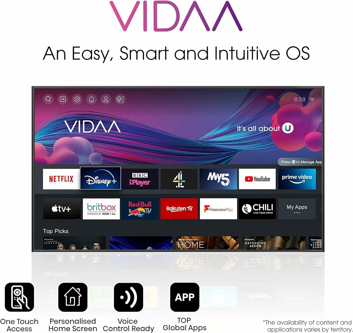 Direct Full Array, 4K AI Upscaler, Precision Colour, Pixel Tuning, Depth Enhancer, Smooth Motion, Game Mode, Plus Game Bar, Dolby Audio, DTS Virtual: X, EZPlay, AI Picture AI Sports Mode Adaptive Light Sensor Dolby Vision Filmmaker Mode, VIDAA U7, Smart Home Ready, VIDAA Voice, Share to TV, Eye Care Mode, Parental Control, Bezelless Design,