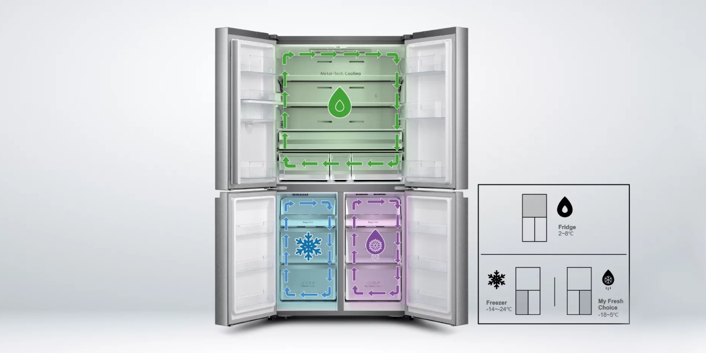 There’s plenty of space in both the fridge and freezer to store any shape or type of food. With four doors that open wide, you can see everything at a glance, making it easy to organize and access your items.
