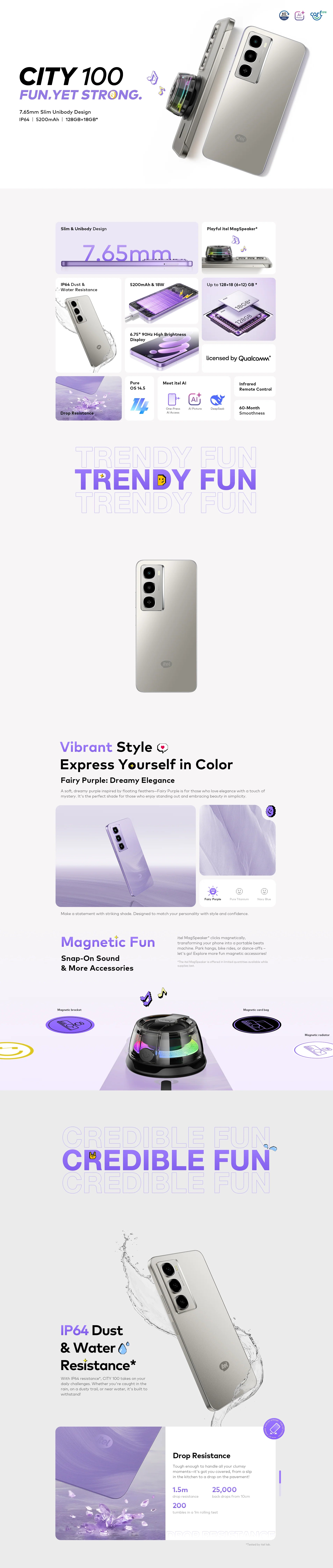With its slim design and tough durability, City 100 is the perfect companion for urban explorers and trendsetters alike. Whether you're snapping photos on the go or powering through your busy day, this device delivers fun, yet strong performance every step of the way.
