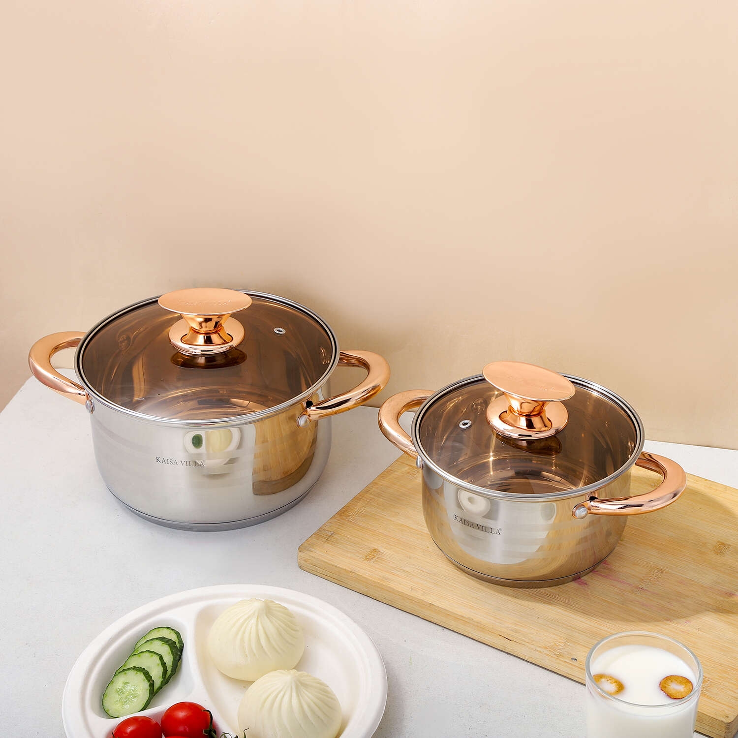 This cookware set has lids made of tempered glass with a hole for steam release.Fastening handles: Reliable riveted connection.The set is packed in a box and has a modern,attractive design.Great House Warming Gift 6 Pieces Kaisa Stainless Steel Induction Villa Cookware Set including the cover This Stainless Steel Induction Villa Cookware Set s durable and made with heavy-duty Stainless Steel material. it can be used on any kind of Gas, Electric, Halogen and Induction hob, etc. It has a beautiful high shine finishand looks lovely in ANY KITCHEN