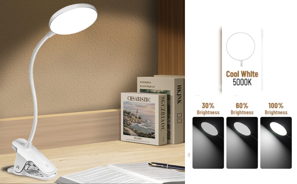 | Eye-protecting Light The LED reading lamp features a double-layer light source, providing soft, flicker-free light without shadows or discomfort. | 360° Flexible Neck The adjustable arm offers flexibility in positioning light for your work, ensuring it doesn't disturb your partner or roommate. | Strong Clamp The large, sturdy clamp easily attaches to any workspace for desk work or study and can also clip onto your bed for reading. |