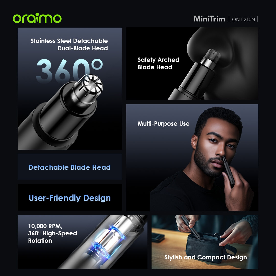Removable double-edged stainless steel blades for 360° trimming, staying sharp and gentle on your nose.
