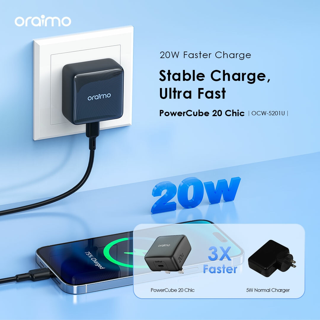 oraimo Wall Charger offers 20W stable and fast charging, which is 3 times faster than a normal 5W charger, ensuring your device rapidly reaches full charge.