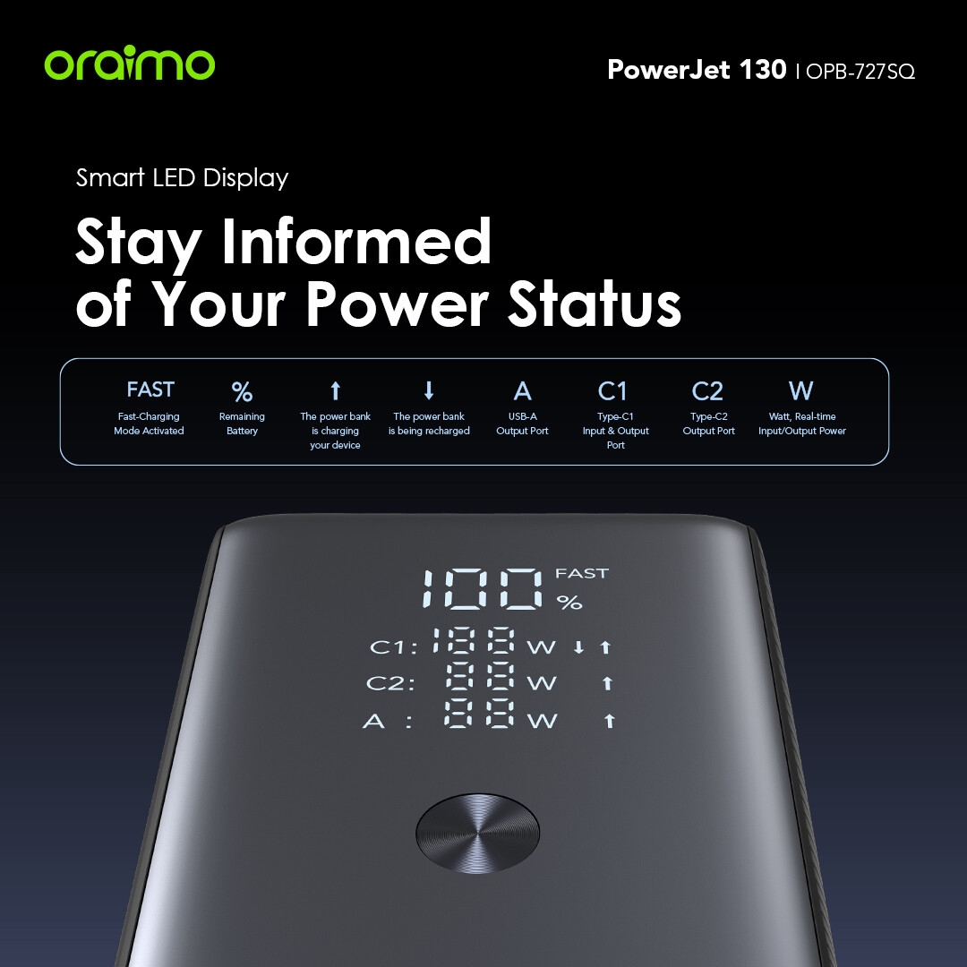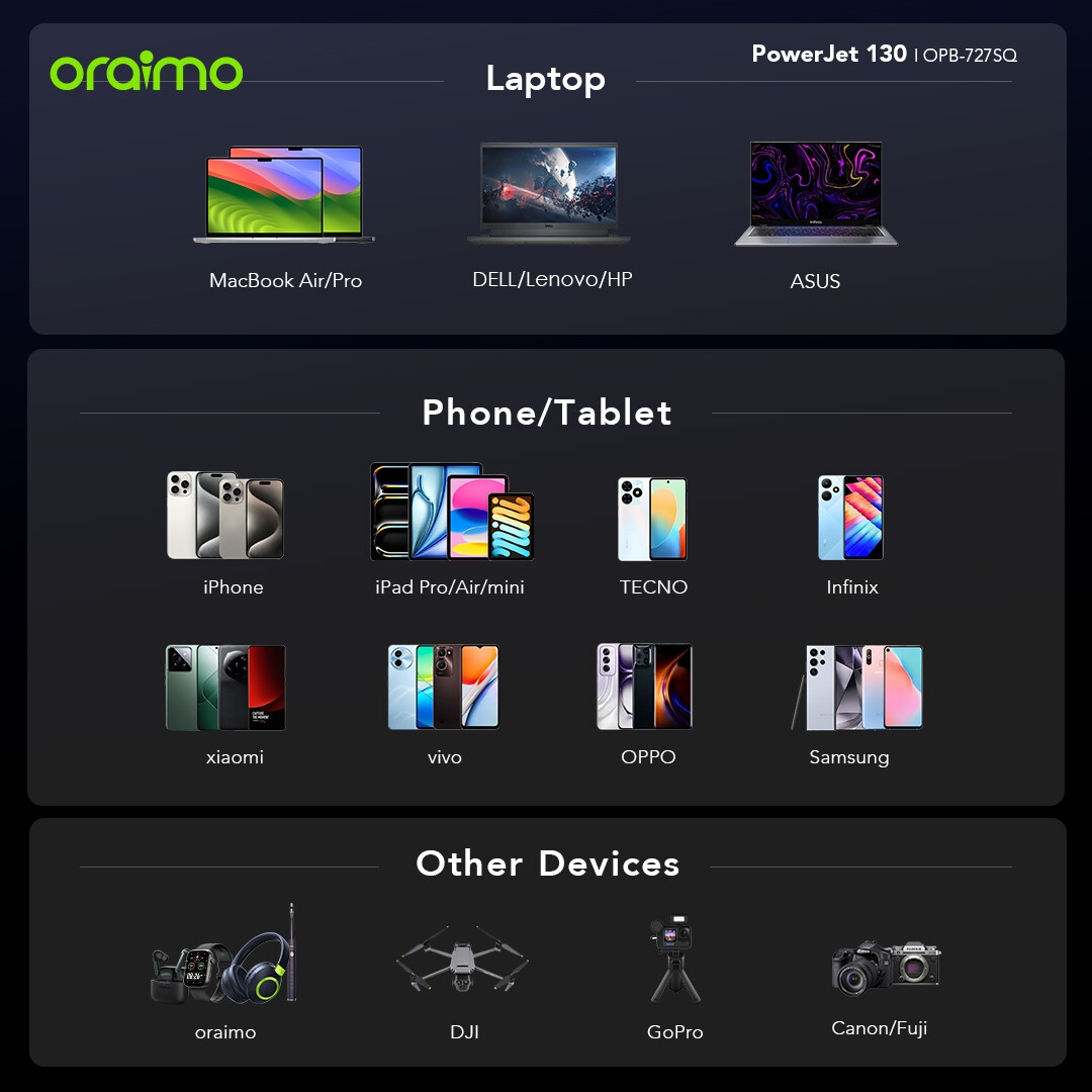 *Oraimo PowerJet 130 Power Bank is compatible with more than 1,000 major devices, including Apple, SAMSUNG, Tecno, Infinix and Mi smartphones and Type-C port charging Laptops such as MacBook Pro 13"/ MacBookPro 14" / MacBook Pro 15"/MacBook Pro 16"/MacBook Air Series; Google Pixelbook and more.