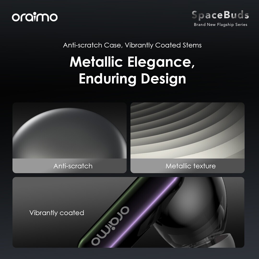 Inspired by lunar eclipses, SpaceBuds illustrates the cycle of time and space, moonlight and shadow. The transparent and metallic 3D flowing texture grants it a light feel, creating a "flow illusion".