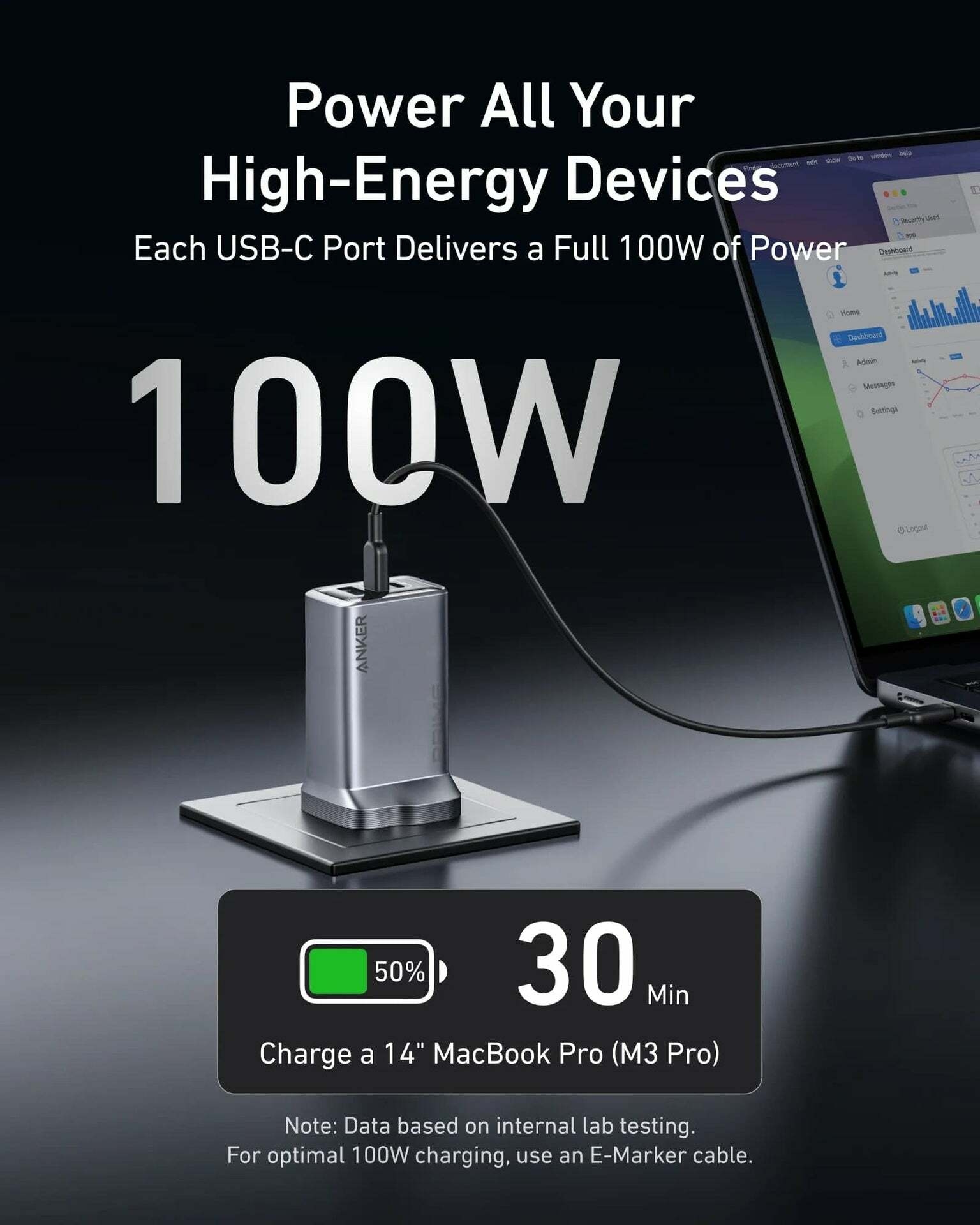 Each USB-C port delivers a full 100W, efficiently charging your 14-inch MacBook Pro (M3 Pro) from 0 to 50% in just 30 minutes.