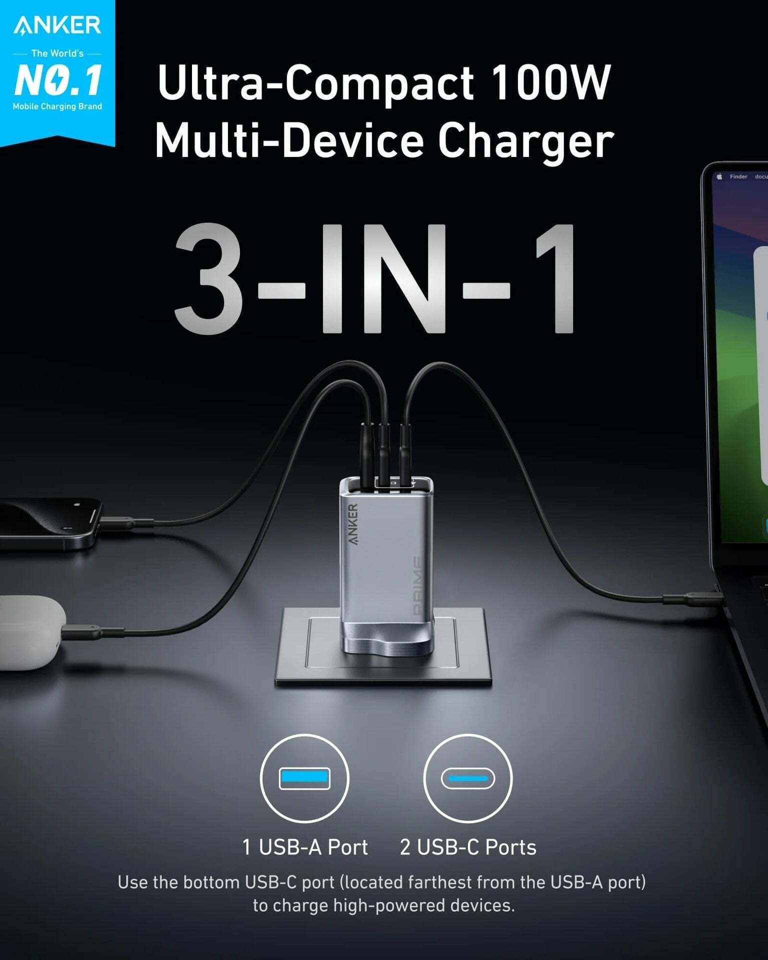 Power up three devices simultaneously with a total of 100W output through two USB-C and one USB-A port for efficient power distribution.
