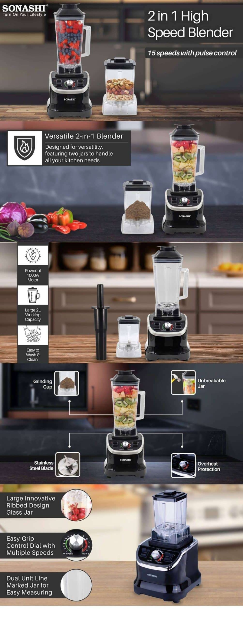 Stand Mixer: Sonashi 2 in 1 kitchen blender is powered by a 1000W robust motor. It has two-speed modes with pulse rotation for fast grinding and mixing.
