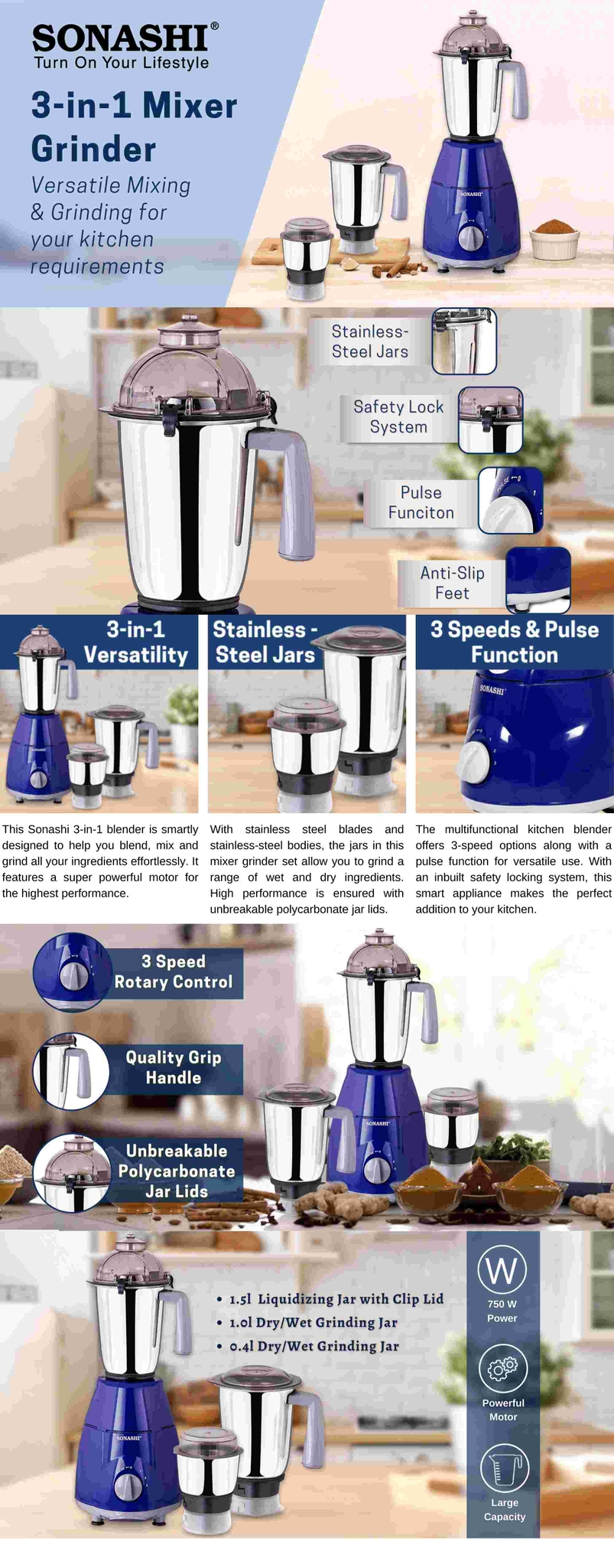 PRODUCT SPECIFICATIONS: Blue kitchen mixer grinder comes with a powerful 750W motor with overheat protection. It has high-gloss body. Rated for 220-240V, 50/60Hz.