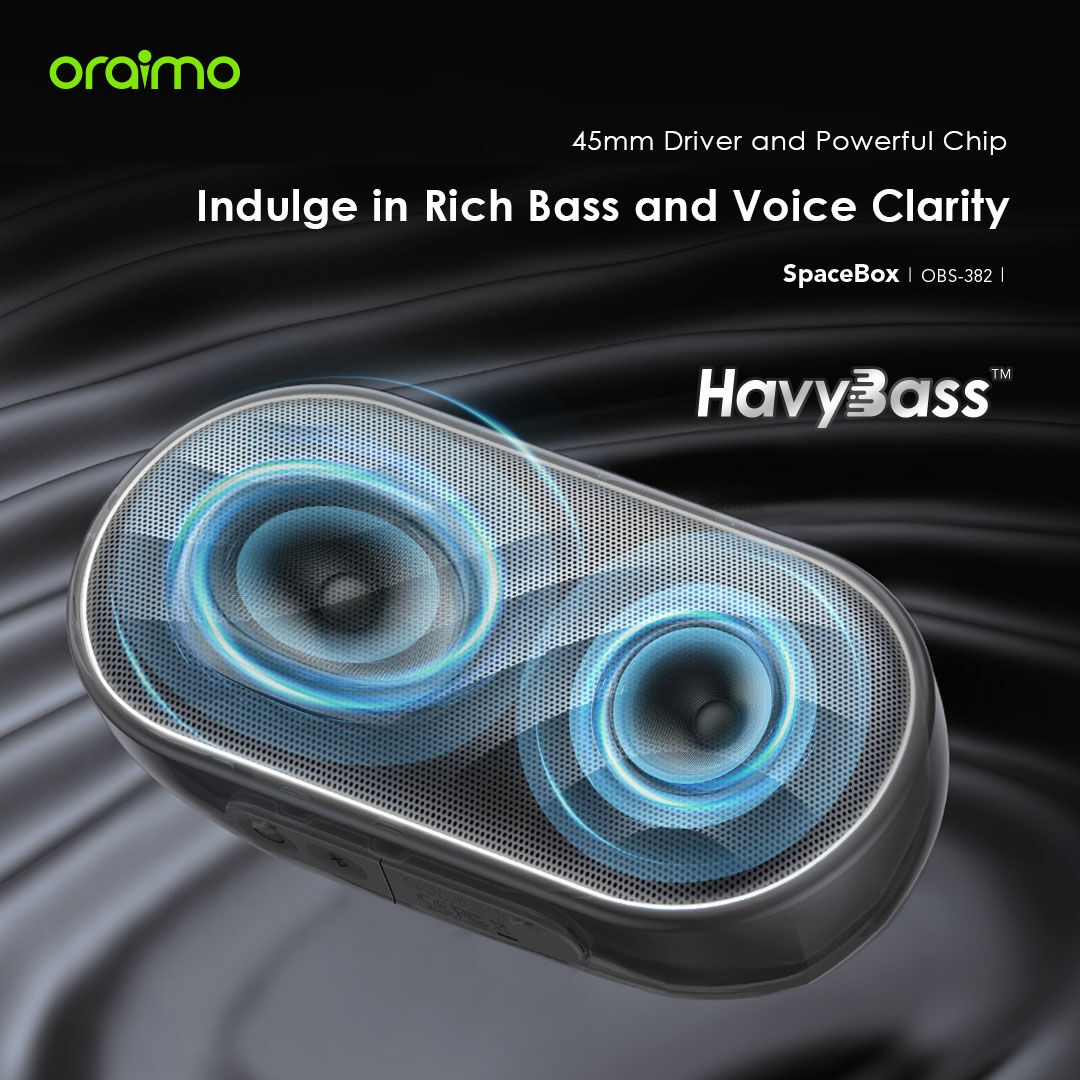 The Bluetooth Speaker delivers powerful oraimo Pro Sound with impactful bass in a compact design, featuring professional acoustic engineering and exclusive HavyBass™ technology.