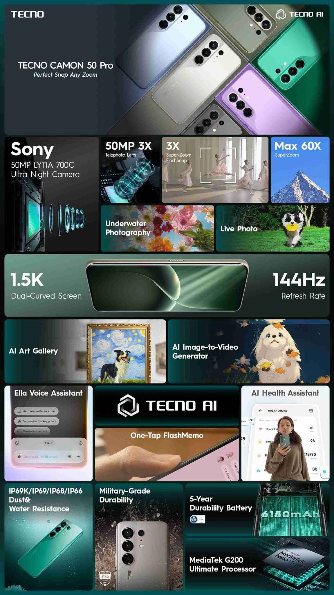 Rear: 50 MP 1/1.56" OIS + 50 MP 3X + 8 MP ultra-wide