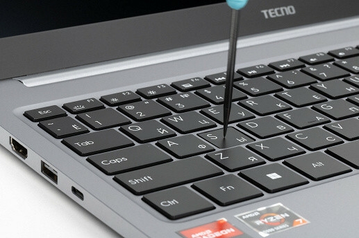 The keyboard is completely identical to the one we already had in the Tecno Megabook T15AA model: membrane with an island button arrangement and a three-row numeric keypad. The up and down arrow keys are «half» height.