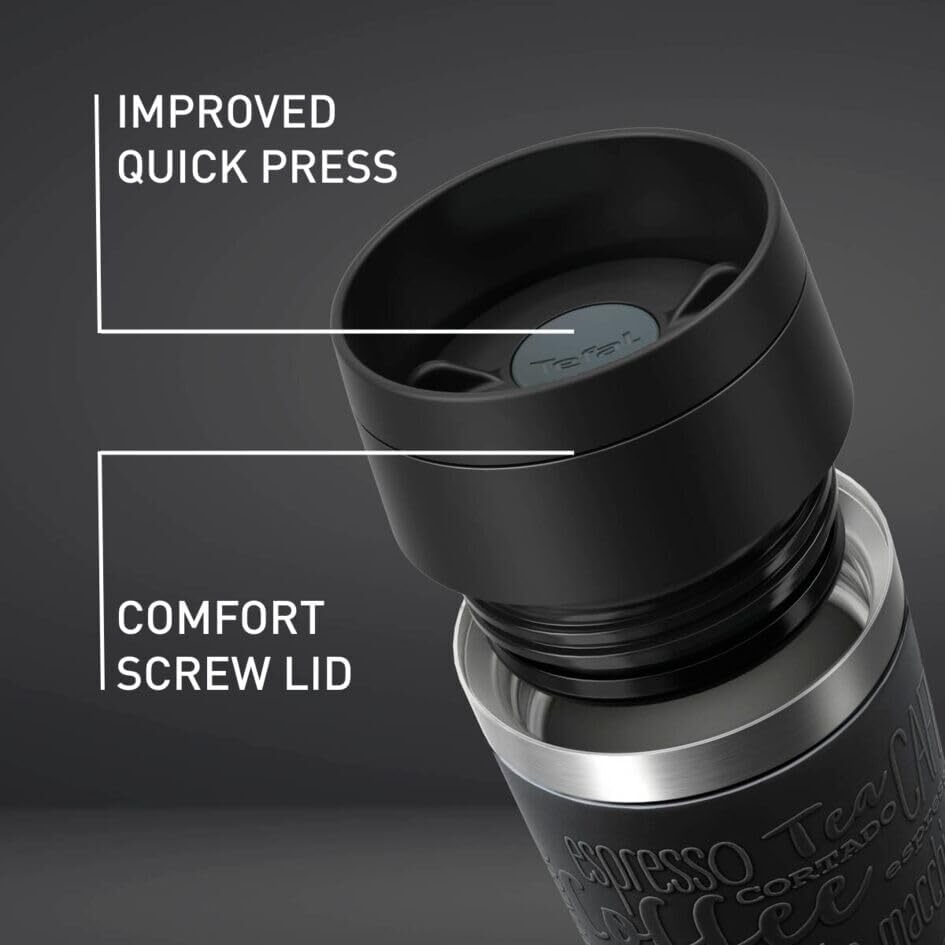 Tefal Travel Mug Classic, Comfort Screw Lid, Quick Press, Soft-Touch Sleeve, Travel-Ready, Reusable, 100% Leak-Proof, Keeps Drinks Cold (8 hrs) and Hot (4 hrs), 360° Drinking, N2020210-Black