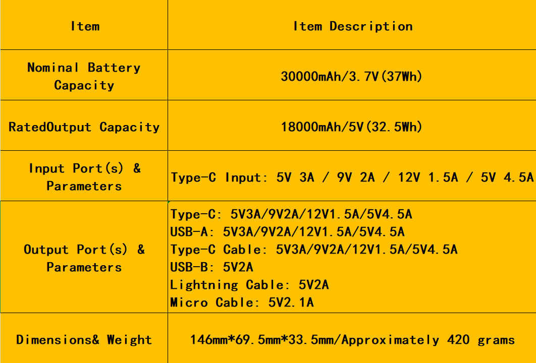 ● The rated total capacity of the power bank's internal battery cells (e.g., 30000mAh) is measured at 3.7V.