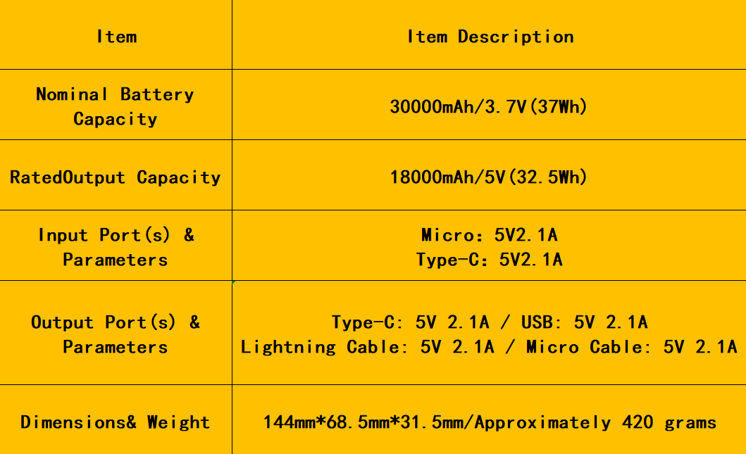 ● The rated total capacity of the power bank's internal battery cells (e.g., 30000mAh) is measured at 3.7V.