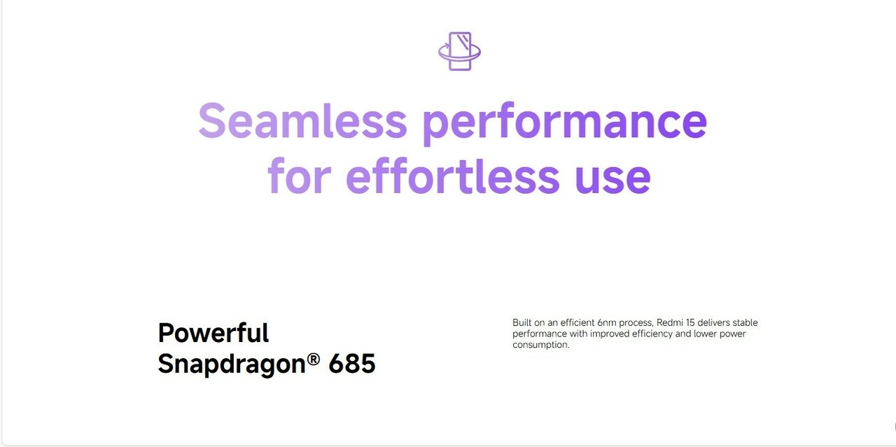 Snapdragon 685 (6nm) processor and 8GB of RAM ensure that the Redmi 15 4G runs smoothly, even while using resource-intensive applications, while Android 15 on HyperOS 2 operating system give the handset a more modern and attractive appearance. You can capture stunning landscapes with the 50MP rear camera, and snap crystal-clear selfies and 1080p videos with the 8MP front-facing camera. The 128GB or 256GB internal storage is perfect for storing all your favourite photographs and data. Additionally, a microSD card can be used to expand the storage capacity.